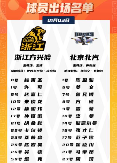 北京本土后场核心陈盈骏因伤连续缺席3场后迎来复出,另一位本土后场核心赵睿缺席,广厦FMVP布朗连续两场缺席。
