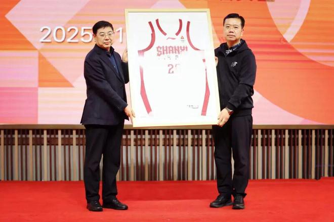 发布会现场,山西汾酒集团党委书记、董事长袁清茂向山西广播电视台党委书记、台长刘英魁赠送CBA山西汾酒男篮成立20周年纪念版战袍。